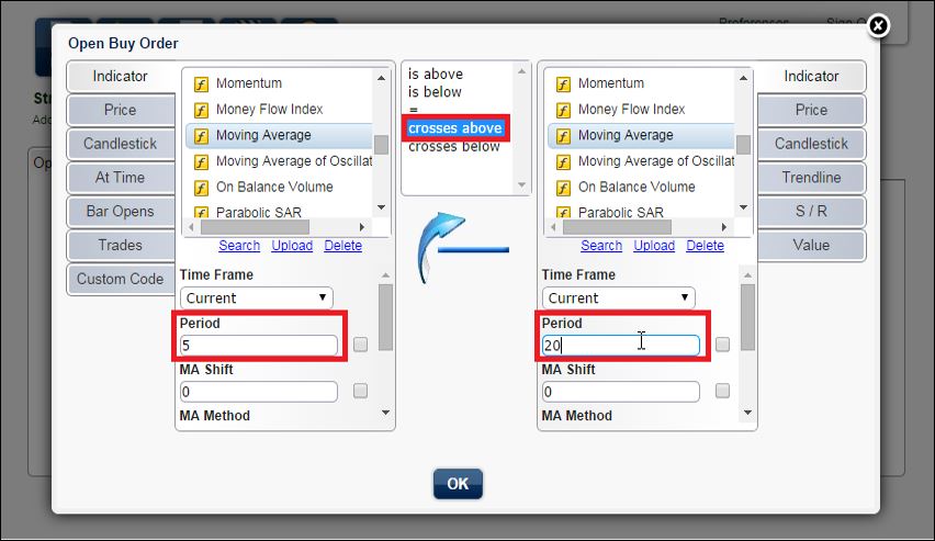 “Is above” creates a continuous signal, meaning an order will be opened on every tick as long as the 5-period moving average remains above the 20-period moving average.